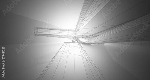 Drawing abstract architectural white interior of a minimalist house with large windows. 3D illustration and rendering.
