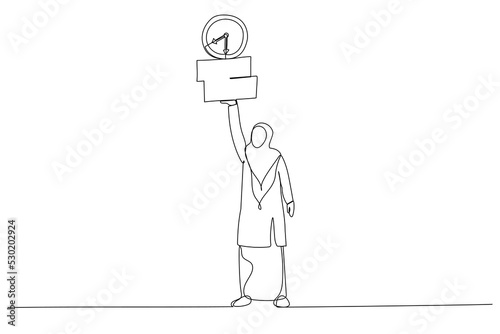 Drawing of muslim businesswoman working with laptop while carrying load of paperwork. Ability to work under pressure. Single line art style