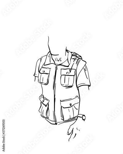 Drawing of vest with many pockets on young man with no face, Vector sketch Isolated hand drawn