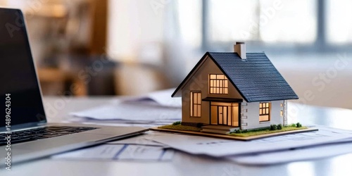 Dream Home Planning: Laptop, House Model, and Blueprints