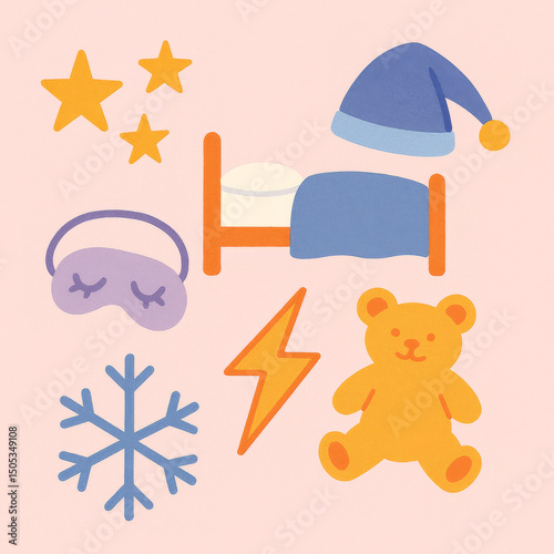 Dreamland Elements: An array of charming illustrations featuring essential items for a restful night, depicting stars, bed, sleep mask, snowflake, lightning bolt, and a teddy bear.