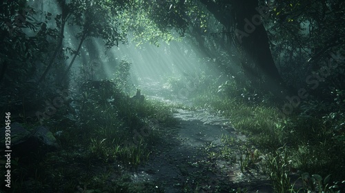 Dreamlike forest path, dense fog rolling over the trail, subtle glimmers of sunlight reflecting off wet leaves, and a mysterious calm filling the air