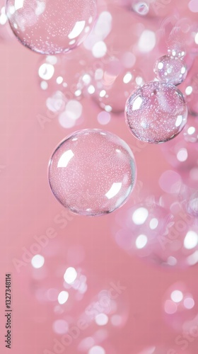 Dreamy Bubbles: Captivating imagery of transparent bubbles rising gracefully against a soft, rosy backdrop, evokes a sense of whimsy and lightheartedness.