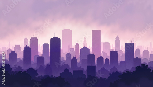 Dreamy city skyline silhouette in purple hues with fog and soft atmosphere