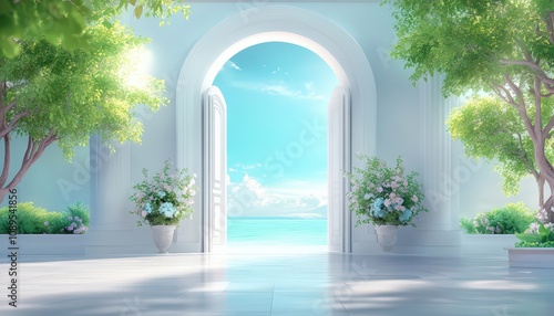 Dreamy Coastal View Through Open Doors Framed by Lush Greenery and Flowering Plants in a Bright, Serene Space Filled with Natural Light