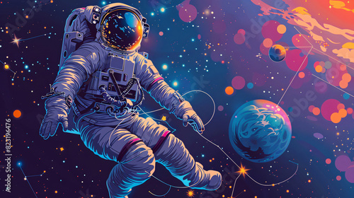 Dreamy cosmonaut on a spacewalk, surrounded by stars and planets