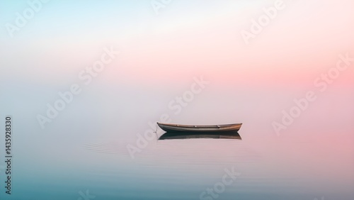 Dreamy early morning lake scene with calm, glassy waters reflecting a soft pink-to-teal gradient sky. A solitary wooden rowboat drifts quietly, surrounded by mist and delicate ripples. The mood is pea