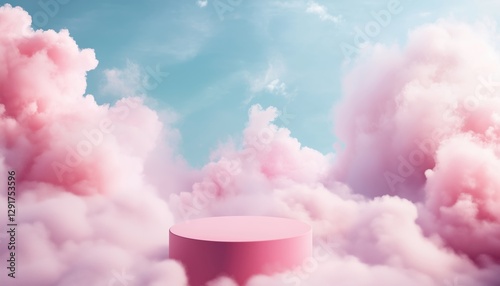 Dreamy Heaven Platform: Pink Podium And Pastel Smoke In Blue Sky - Realistic Product Display Mockup In A Dreamlike Setting.
