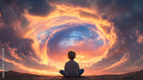 Dreamy Horizon of Imagination - A child sits peacefully, gazing into a mesmerizing swirling sky filled with vibrant colors, symbolizing wonder, dreams, curiosity, and exploration.