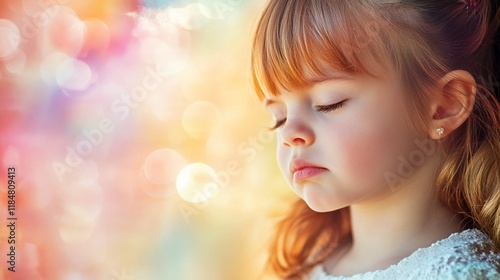 Dreamy portrait of a young child with closed eyes against colorful bokeh background, expressing serenity and innocence. Soft lighting creates magical atmosphere in this gentle image.