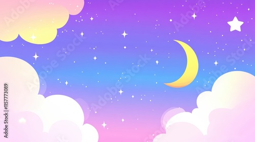 Dreamy Sky with Clouds, Moon and Stars in Soft Pastel Colors