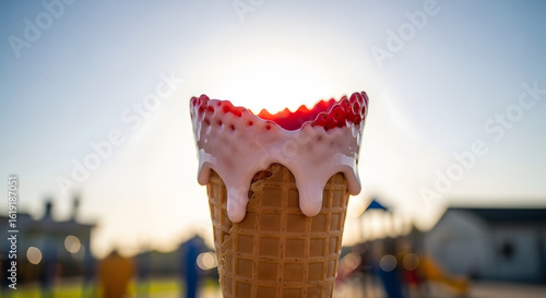 Dreamy Strawberry Ice Cream Cone Melting in the Sun with Playground Bokeh Background
