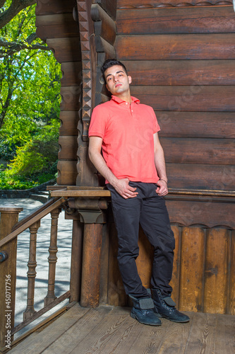 Dressing in a red Polo shirt, black pants and boots, two hands rested on hips, a young handsome guy is leaning by an old fashion style, wooden house doorway, thoughtfully looking at you..