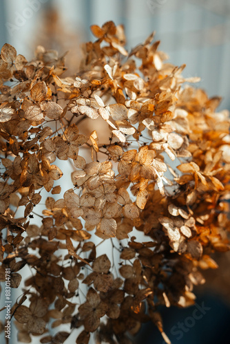 Dried and brown from the winter season, hydrangeas still make an interesting bouquet with a bokeh background.