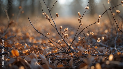 Dried branches and flowers on forest floor with fallen leaves in soft natural light Copy Space