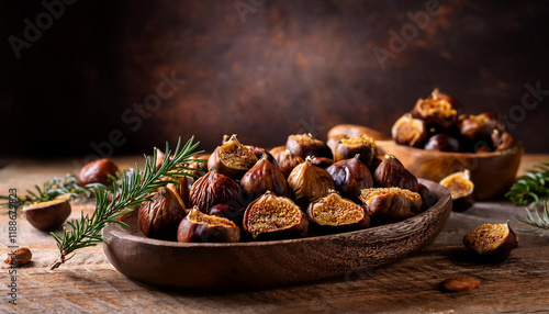 Dried Figs and Chestnuts Autumn Harvest, Rustic Bowl, Wooden Table, Generated image