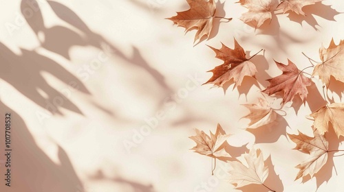 Dried maple leaves on pastel sunlit background with shadow. Autumn, fall, thanksgiving day concept. Flat lay, top view