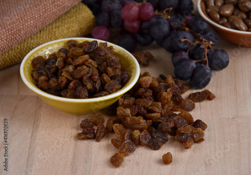 Dried raisins with a bunch of grapes stock images. Raisins sultanas still life photo images. Drying grapes and raisins in chocolate images