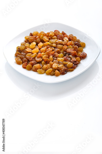 Dried sweet golden raisins on isolate on white background copy space.