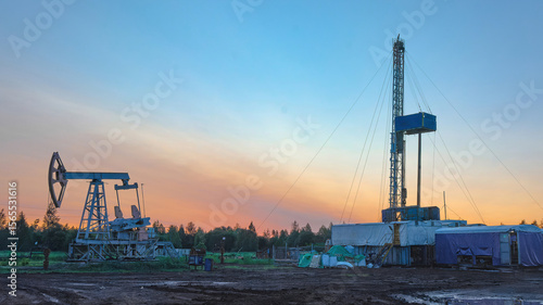 Drilling a well in an oil field. In the foreground is a mobile drilling rig. In the background, oil production at the field using a rocking machine. Summer. Beautiful sky and nature.