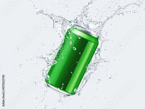 Drink can with vibrant splash of liquid against soft pastel background, fizzy, party