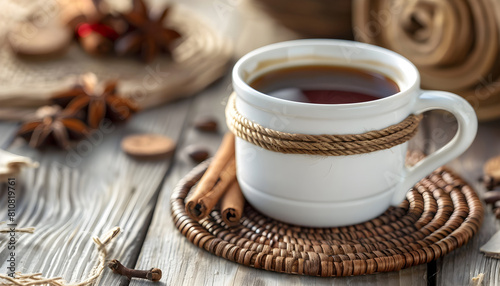Drink coasters with cup of coffee, cinnamon and jezve on wooden table