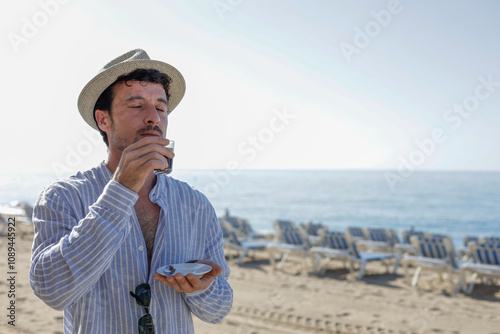 Drinking coffee on the beach. Attractive man enjoying the sea view from the beach bar on a sunny day reflecting on life.