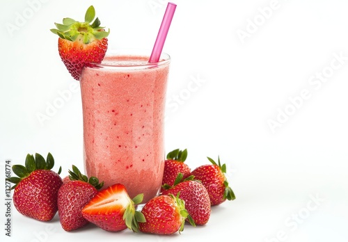 Drinking Fresh Strawberry Smoothie with Straw and Ripe Fruit Garnish