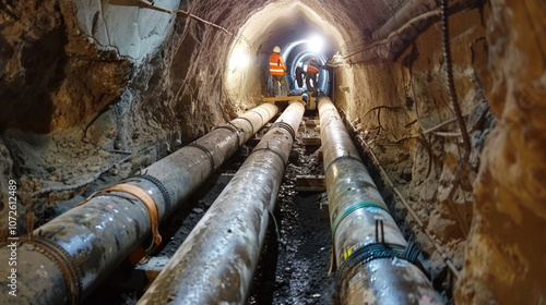 Drinking water plumbing pipeline repair construction in spring time concept. Workers install underground pipes for water, sewerage electricity and fiber optics for the population of urban center.