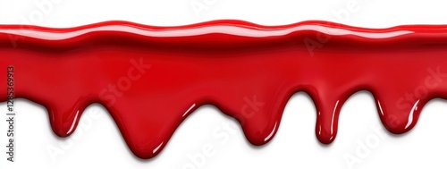 Dripping red liquid, glossy texture, isolated on white background. Abstract image ideal for Halloween, horror, or dramatic designs