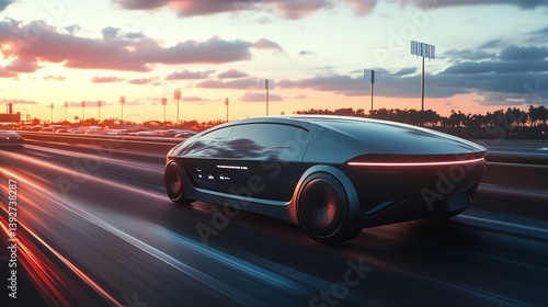 Driving Futuristic Vehicle on Highway at Sunset with Motion Blur