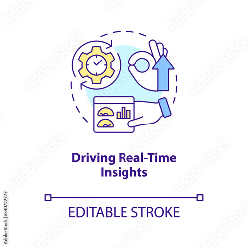 Driving real-time insights concept icon. Monitor business data. Provide innovation abstract idea thin line illustration. Isolated outline drawing. Editable stroke. Arial, Myriad Pro-Bold fonts used
