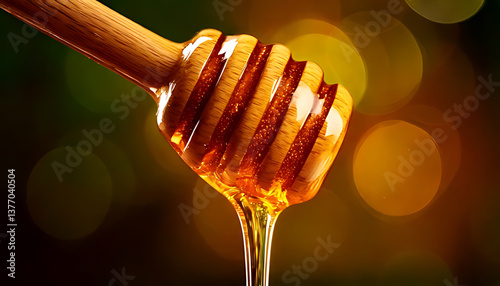 Drizzling golden honey nature's sweetness close-up warm lighting organic concept for health