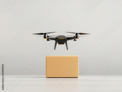 Drone delivering a single sleek package in an empty white space, futuristic minimal shipping