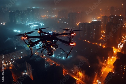 Drone equipped with lighting effects soaring above a vibrant night cityscape with stunning skyline views and glowing buildings