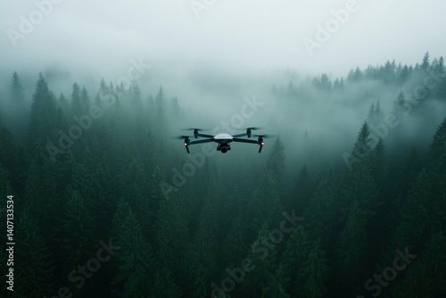 Drone flying above forest in misty weather over green treetops, atmospheric scenery