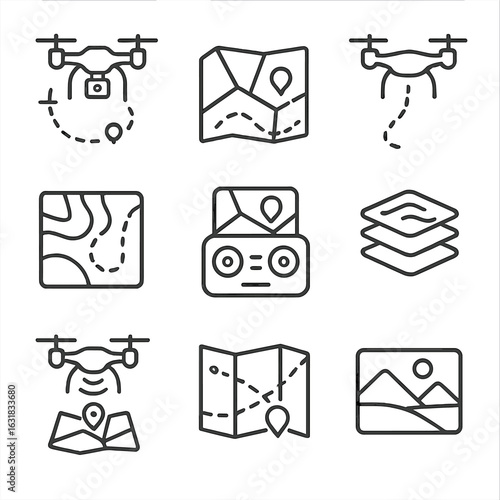 Drone Mapping Icons. Line style icons of aerial and drone-based mapping: drone with camera path, aerial view map icon, flight path