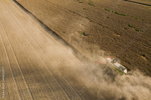 Drone shot of a combine harvester collecting canola on dry dusty farmland for a biofuel.