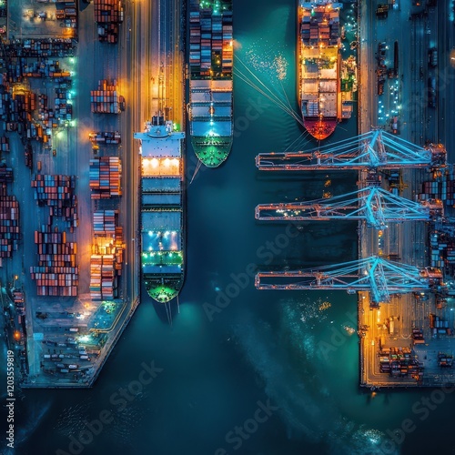 Drone shot of smart city harbor, autonomous cargo ships, hightech cranes, green technology integration