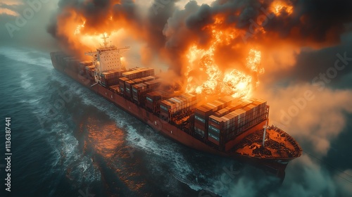 Drone side aerial photography, a container ship docked at the offshore dock, the container on the ship exploded