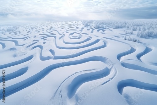 Drone view de surcos en la nieve zigzagueantes, laberinto de nieve, paisaje de la naturaleza salvaje
