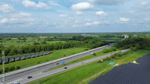 Drone view of a highway in Germany with a lot of traffic and many green fields around it.
