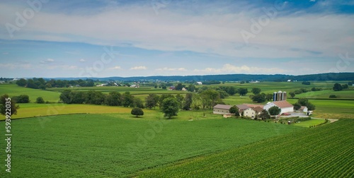 Drone View of Amish Countryside With Barns and Silos, a Patch Work of Corps and Farmlands