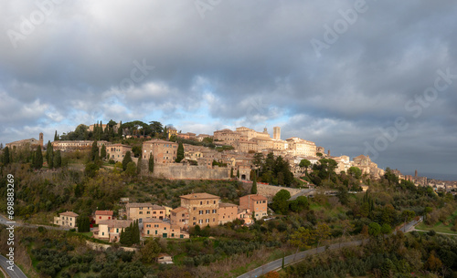 drone view of the Tuscan hilltop village and wine capital of Montepulciano