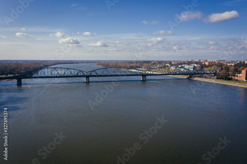 Drone view on the River Vistula and Jozef Pilsudski bridge in Torun city in Poland