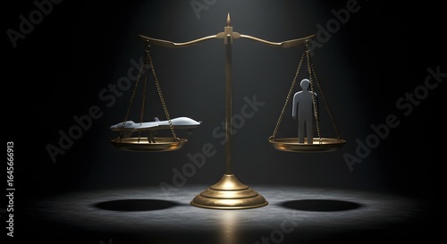 Drone vs. Human: Balancing the Scales - Concept Illustration of a Drone and a Human Figure on a Balance Scale, Symbolizing Ethical and Moral Considerations in Warfare and Technology
