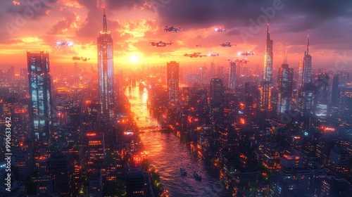 Drone-Filled Sky Over a Neon-Lit Futuristic City Generative AI