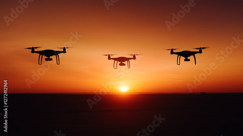 Drones Flying Over the Horizon at Sunset Demonstrating Technology and Exploration with Scenic Background.