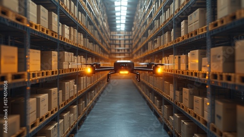 Drones navigate through a warehouse filled with stacked boxes, efficiently sorting and managing inventory during a busy fulfillment process.