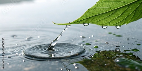 Droplet of rainwater falls from a leaf's surface, landing softly on the wet floor, pervasive moisture, rainfall, glassy surface, droplet